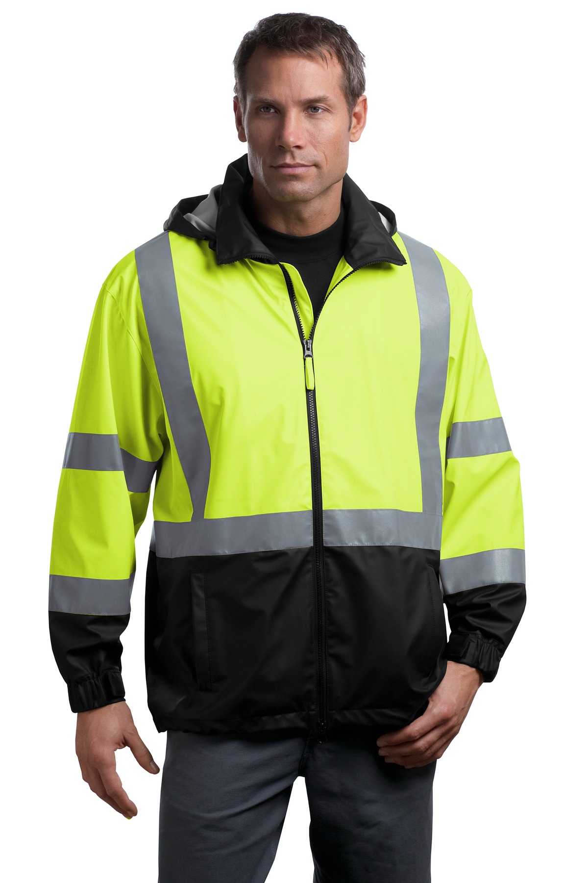Stay safer in inclement weather in this high-visibility windbreaker. ANSI/ISEA 107 Class 3 certified Water resistant 100% PU shell 100% polyester backing 8000MM fabric waterproof rating Snap-off hood with drawcord and toggle for adjustability Two-way black Vislon zipper Internal storm flap Half-elastic adjustable tab cuffs with hook and loop closures 2-in. wide reflective taping on front back and sleeves Two welt pockets Drawcord hem with toggle adjustability This garment must be fully zipped to be in compliance with ANSI/ISEA 107 standards The hood must be detached and stowed when not in use to be in compliance with ANSI/ISEA 107 standards